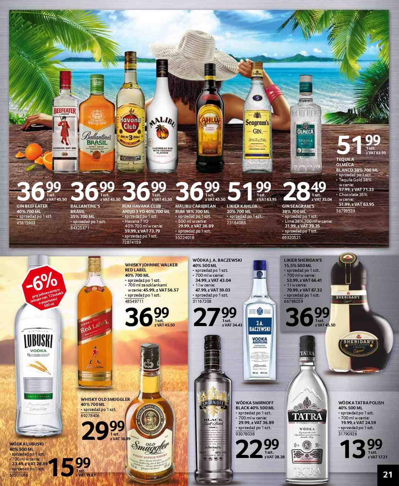 Ballantine's whisky, Johnnie Walker whisky, Old Smuggler whisky, Malibu, Lubuski wódka, Sheridan's likier, Smirnoff wódka, Tatra wódka